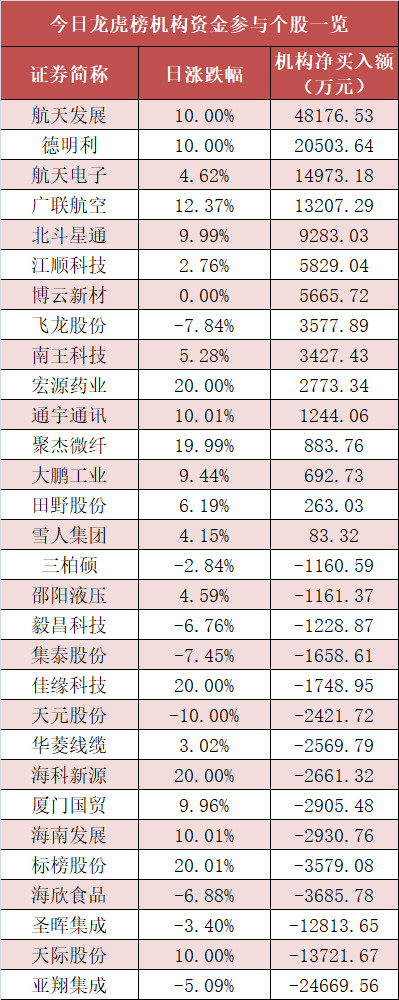 盘后龙虎榜数据显示,机构现身多股,其中航天发展等股票呈现机构资金净买入,亚翔集成等股票呈现机构资金净卖出。