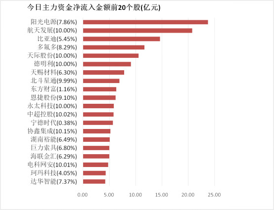 4.阳光电源主力资金净流入23.72亿元居首