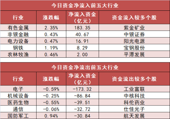 3.有色金属行业净流入183.35亿元居首