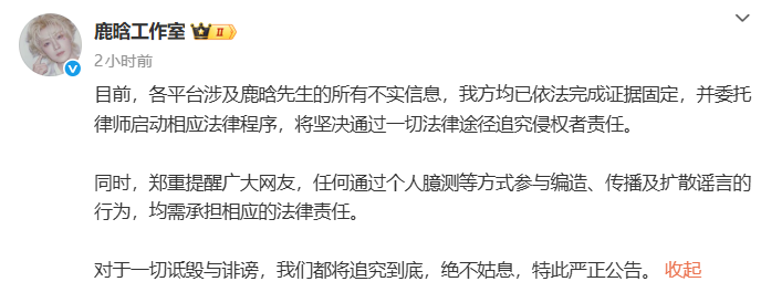 1月3日早晨,男星鹿晗工作室发文:昨夜今晨,针对豆瓣、微博、抖音、小红书等各大平台上对鹿晗先生私生活的大规模造谣与诽谤,我工作室已委托律师依法固定证据数十条,同时已经进入相关法律程序中。我工作室再次提醒广大网友,任何个人或组织如继续通过捏造、散布谣言等方式侵害鹿晗先生名誉,均需依法承担相应的法律责任。请立即停止传播不实信息,并删除已发布的相关内容。