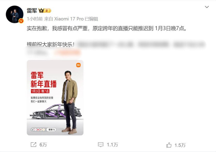 2025年12月31日上午,小米集团董事长雷军发文称,感冒有点严重,原定跨年的直播推迟到1月3日晚7点。