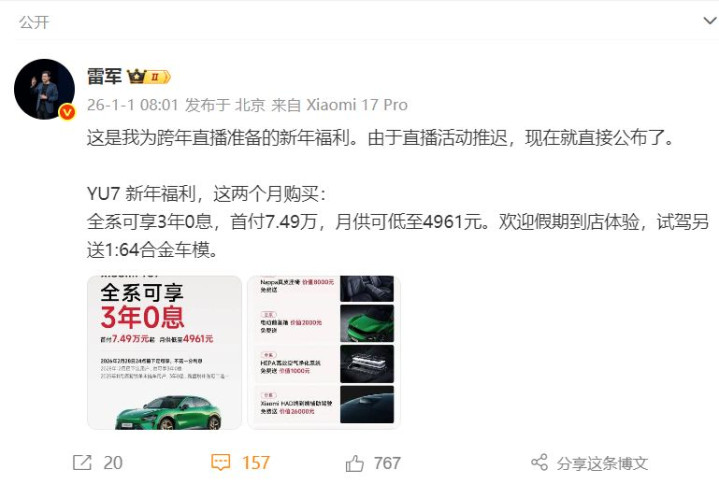 2026年1月1日配资代理平台,雷军在其微博发文称:“这是我为跨年直播准备的新年福利。由于直播活动推迟,现在就直接公布了。YU7新年福利,这两个月购买,全系可享3年0息,首付7.49万,月供可低至4961元。欢迎假期到店体验,试驾另送1:64合金车模。”