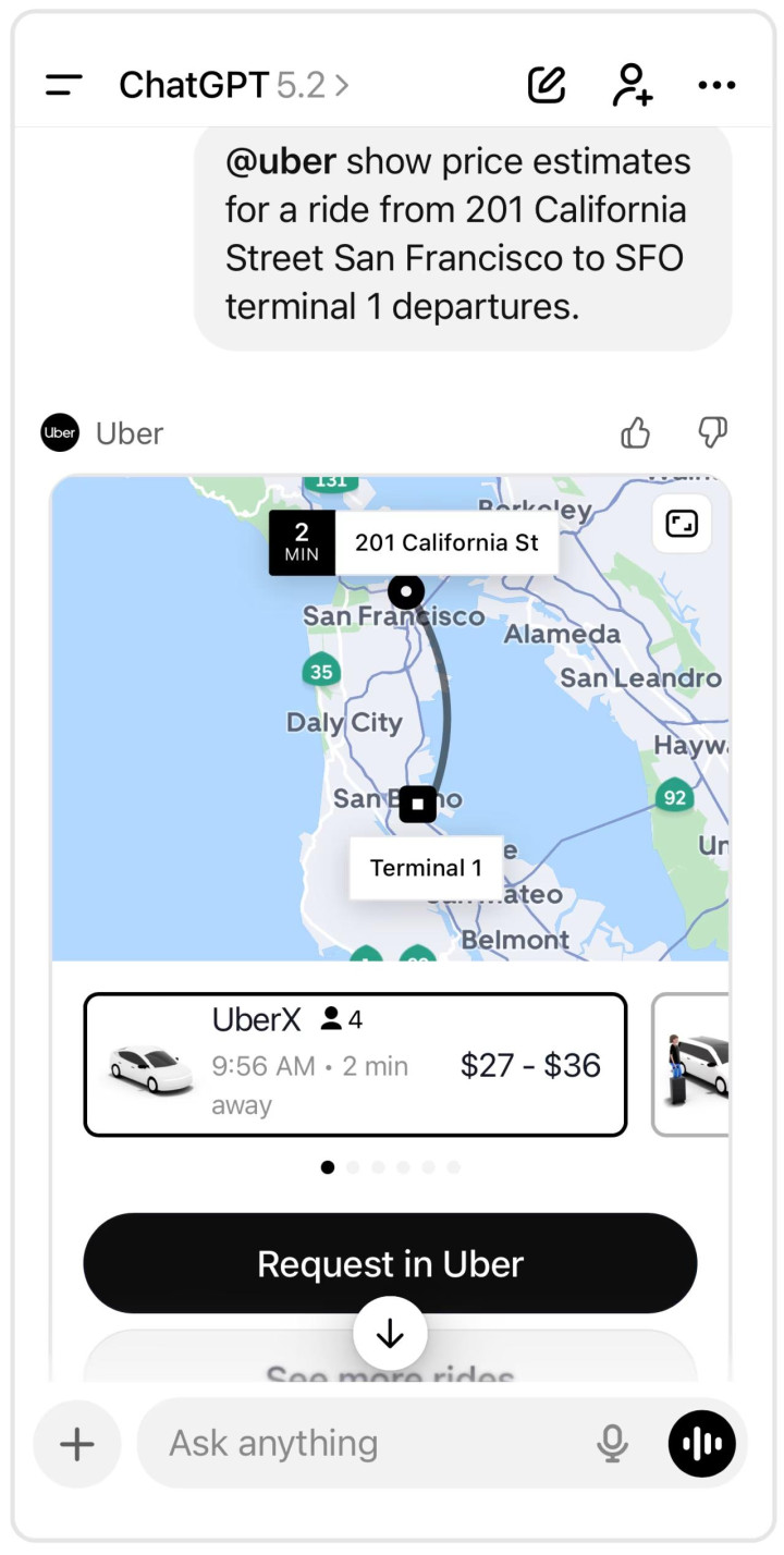 根据《华尔街日报》对ChatGPT应用商店的测试结果,在ChatGPT中使用打车小程序Uber比单独使用Uber App要花费更长的时间。ChatGPT可以估算行程费用和预计到达地点,但无法直接为用户叫车,用户点击按钮后会被转至Uber网页进行预订,且仍需重新输入上车与下车地点。