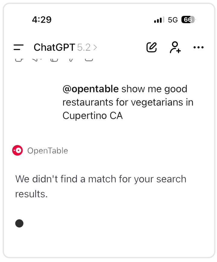 餐厅预订是AI助手的核心应用场景之一,在这一功能上,当体验者要求ChatGPT通过线上订餐平台OpenTable预订餐位时,系统返回了错误信息。相比之下,用户直接通过OpenTable网站完成预订仅需数秒。